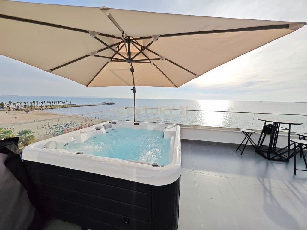 The apartment is located on the beach, Iliria. On the 5th floor of a building with an elevator and administration. With a total area of 95 m2, a veranda of 53 m2, and a 60 m2 terrace which will also have a jacuzzi. It is organized into a living room, two bedrooms, two bathrooms, and a garage. The apartment is in total restoration. It has regular mortgage documentation. For more information, contact us.