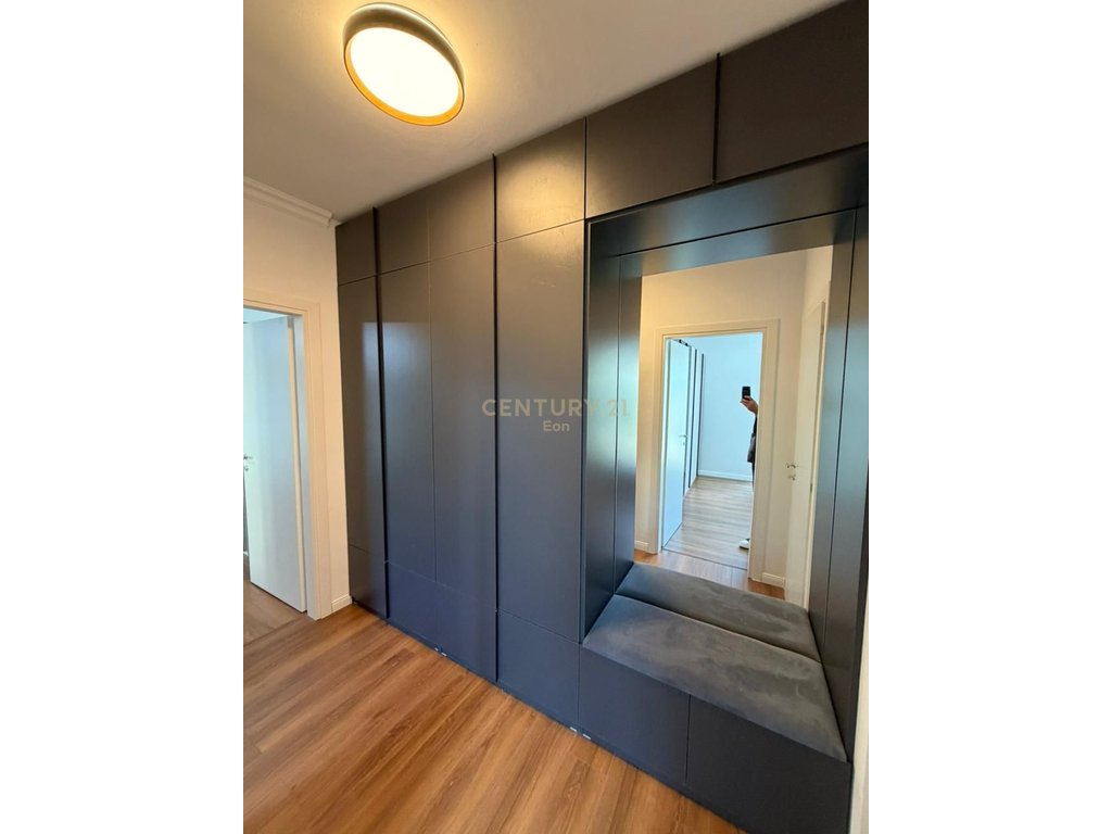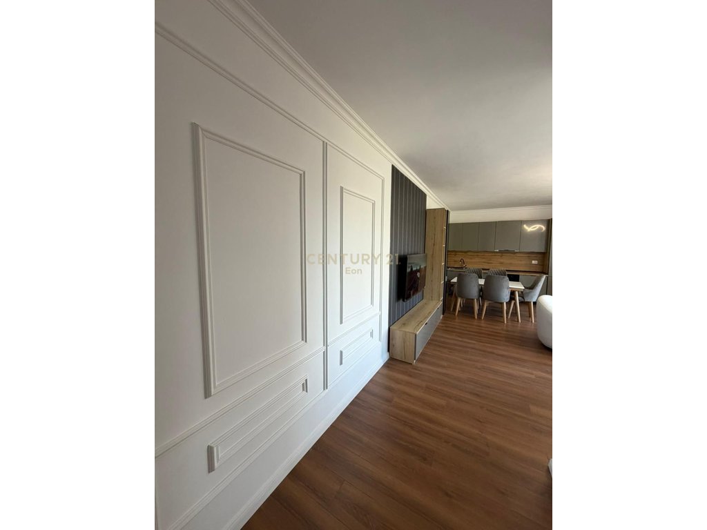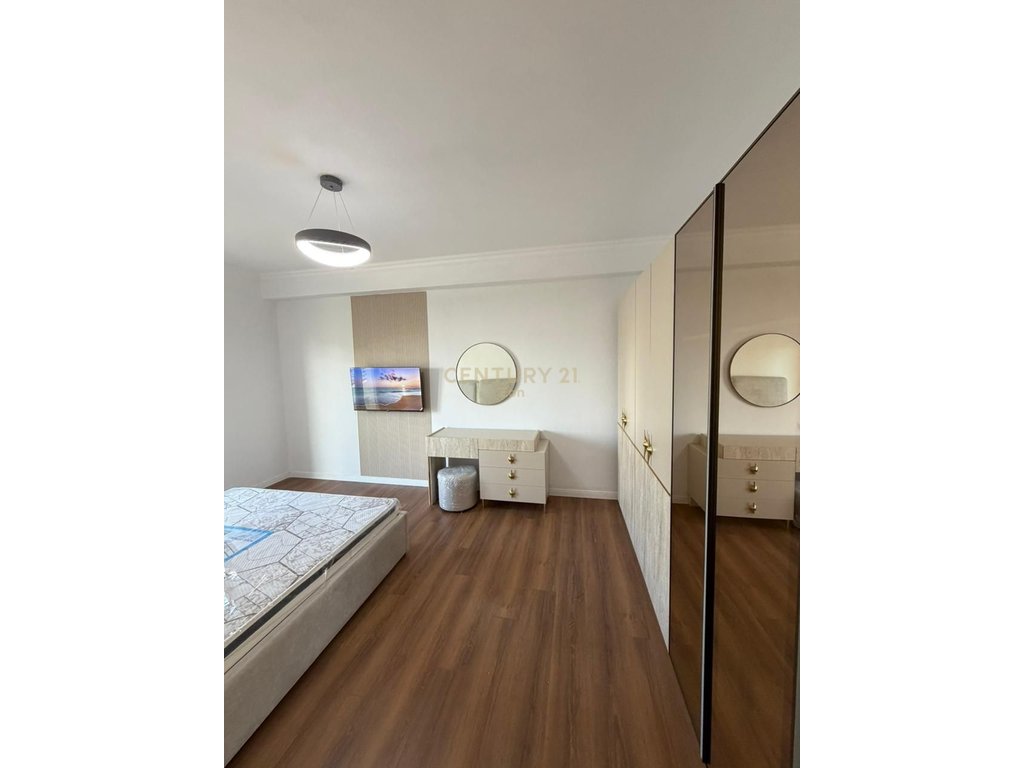 The apartment is located at Shkëmbi i Kavajës, behind the rails, on the second floor of a new building. It has a sea view and is newly furnished. It has a total area of 110 m2. It is 300 meters away from the sea and also has parking for residents. It is organized into a living room and kitchen area, two bedrooms, a bathroom, and all rooms have access to the balcony.