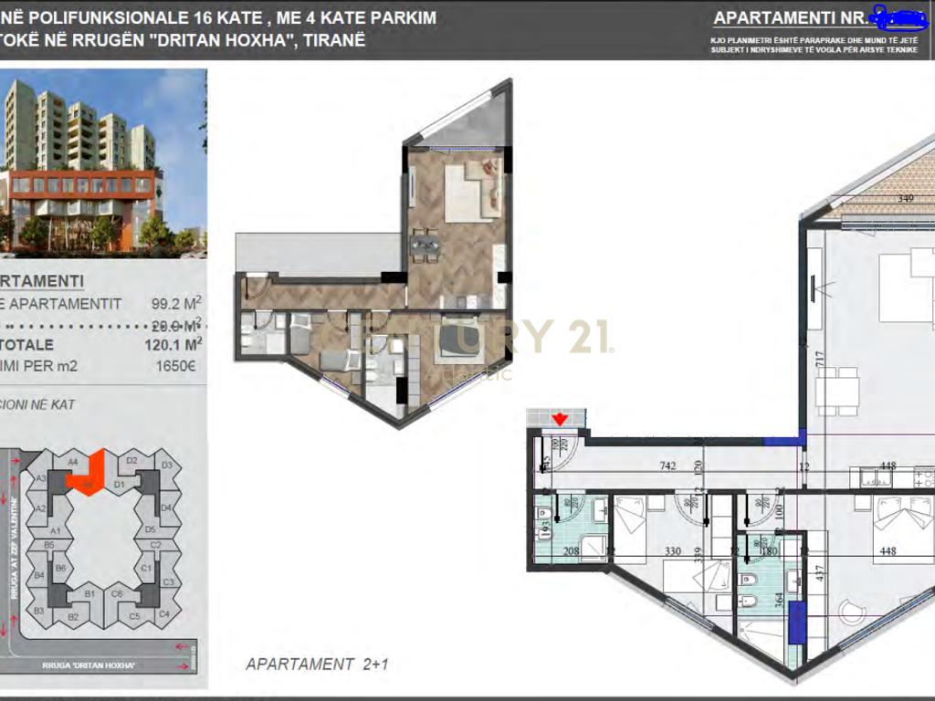 This apartment is located on the 5th floor of a 16-story building in the Laprakë area, Tirana, and is for sale at the price of €195,165.