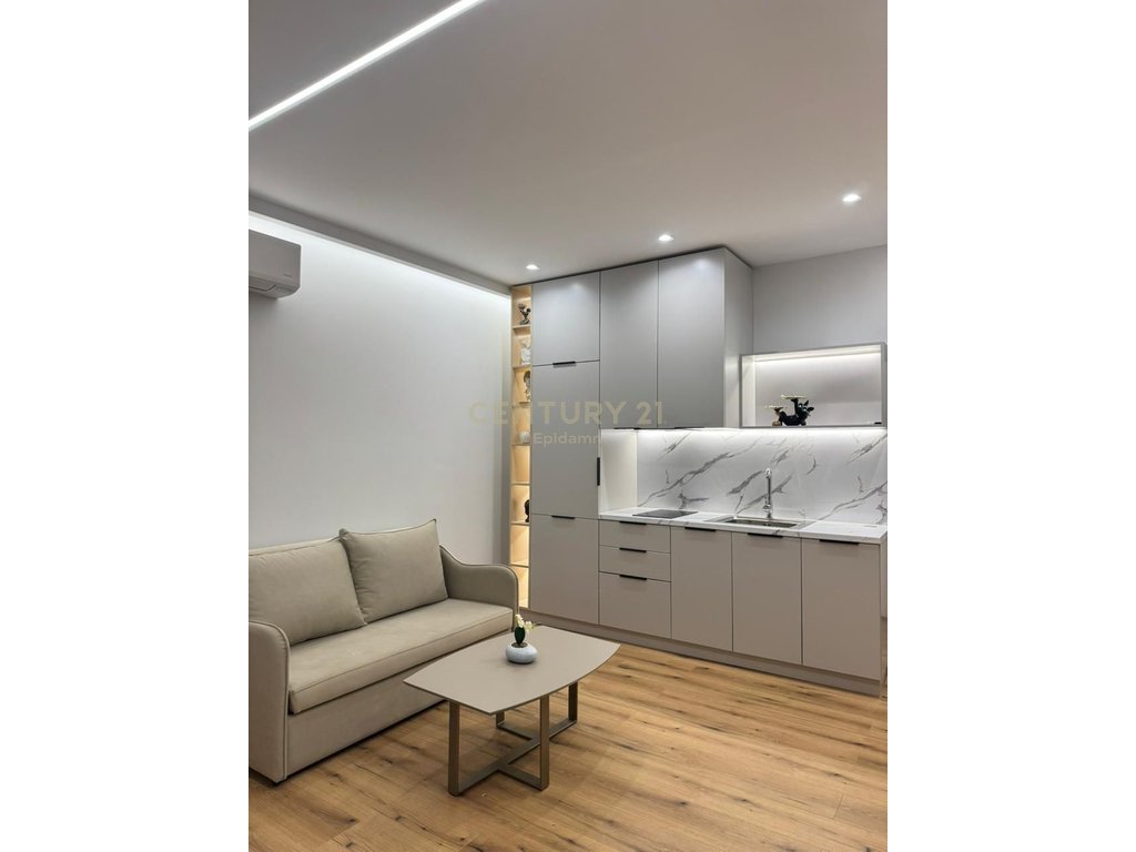 This studio apartment is located on the 8th floor of a building near the Durrës Sports Palace, and is offered for rent at €400 per month.