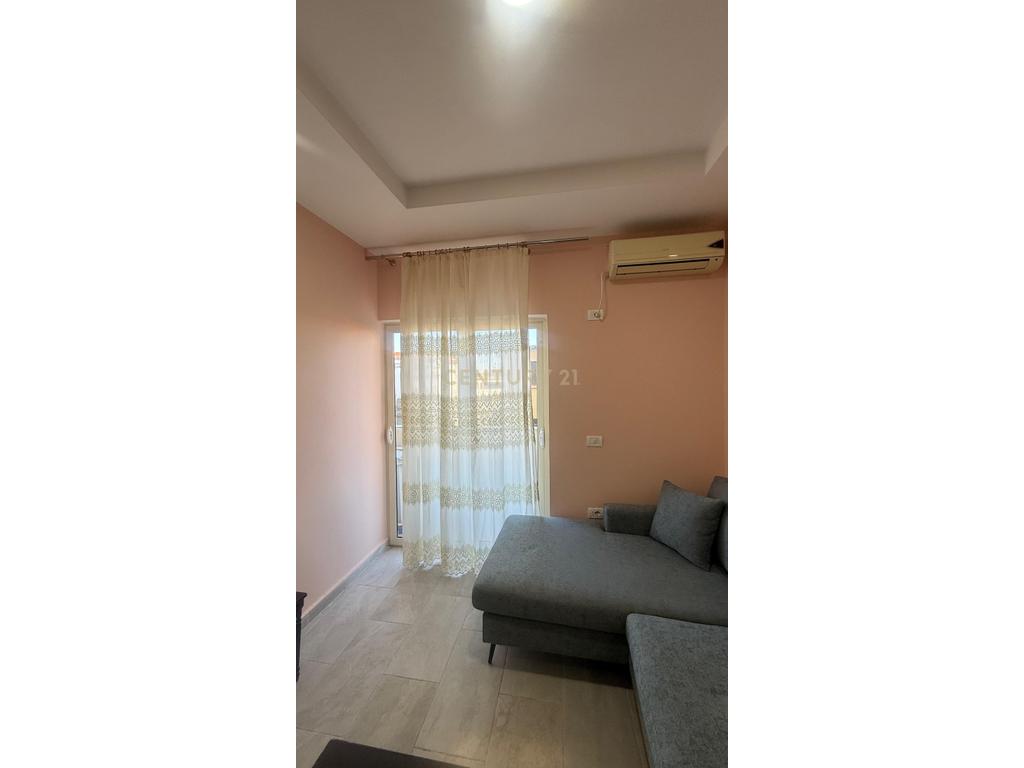 This 1+1 apartment is located on the second floor of an 8-story building in the Plazh Rrota e Kuqe area, Durrës, and is offered for rent at 330,000 LEK per month.