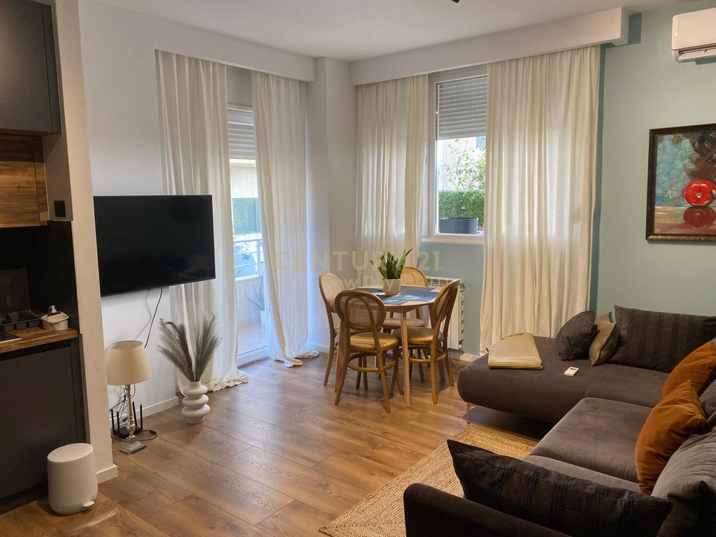 This 1+1 apartment is located on the first floor of a 9-story building in the Shkëmbi i Kavajës area