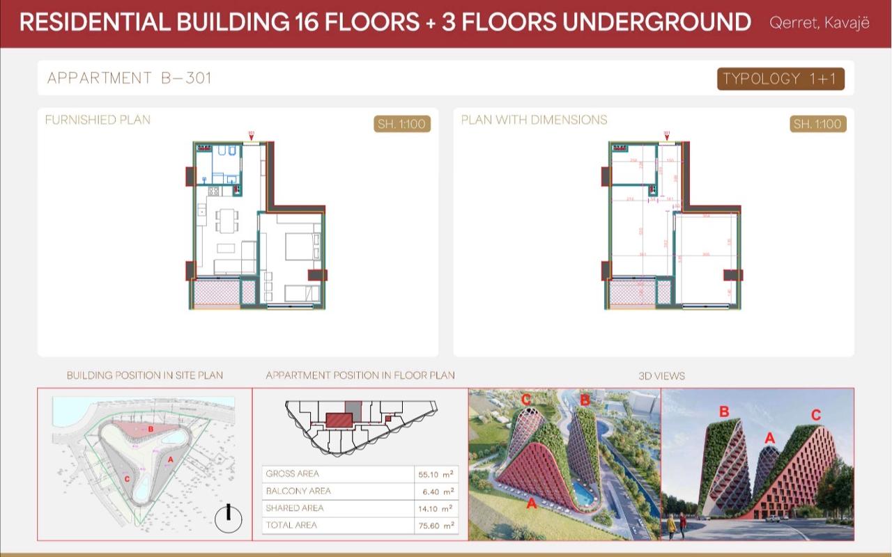 Located in an open and developed environment, the residence consists of several above-ground floors and underground parking levels, ensuring functionality, easy access, and maximum comfort for residents.