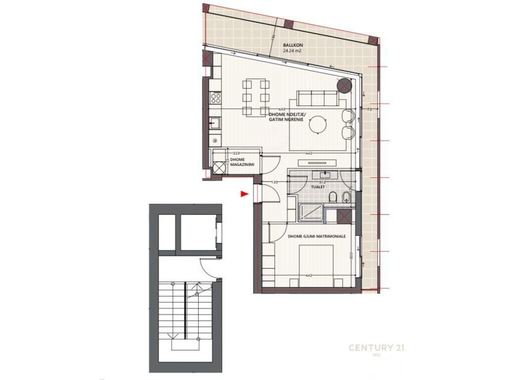 ●Apartamenti eshte i organizuar ne ambientin e dites sebashku me gatimin, 1 dhome gjumi dhe 1 tualet