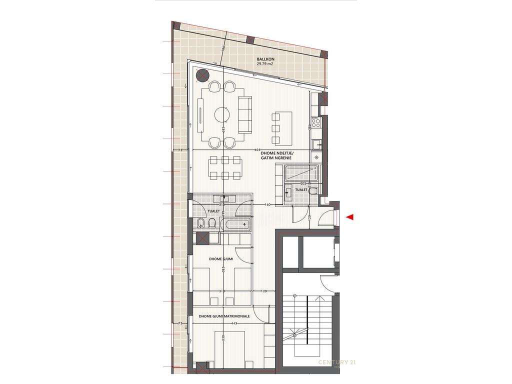 ●Apartamenti eshte i organizuar ne ambientin e dites sebashku me gatimin, 2 dhoma gjumi dhe 2 tualete