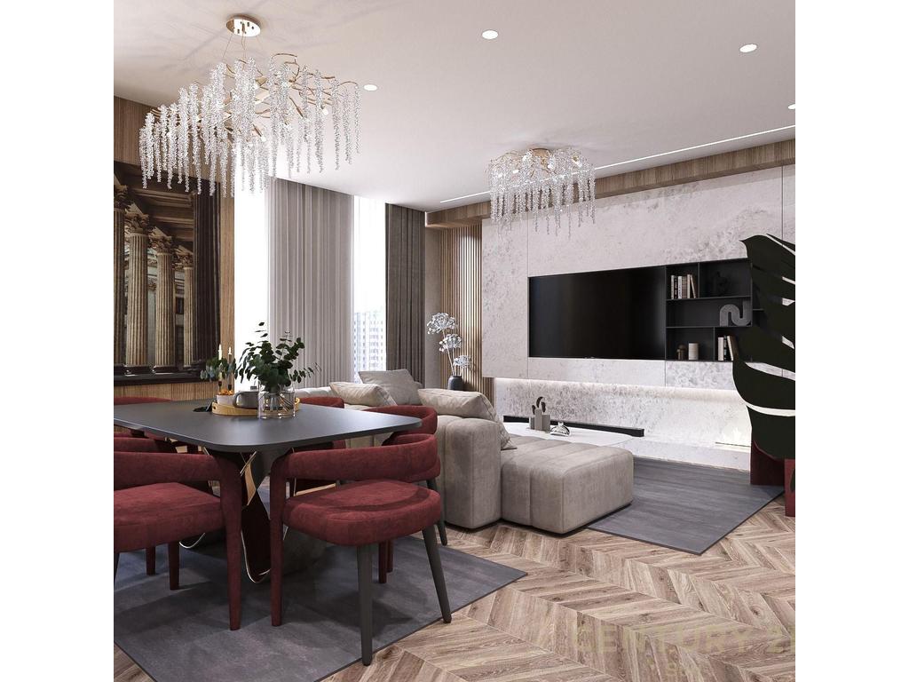Organizohet ne nje ambjent ndenje me kuzhine, tre dhoma fjetie, dy tualete dhe nje ballkon.