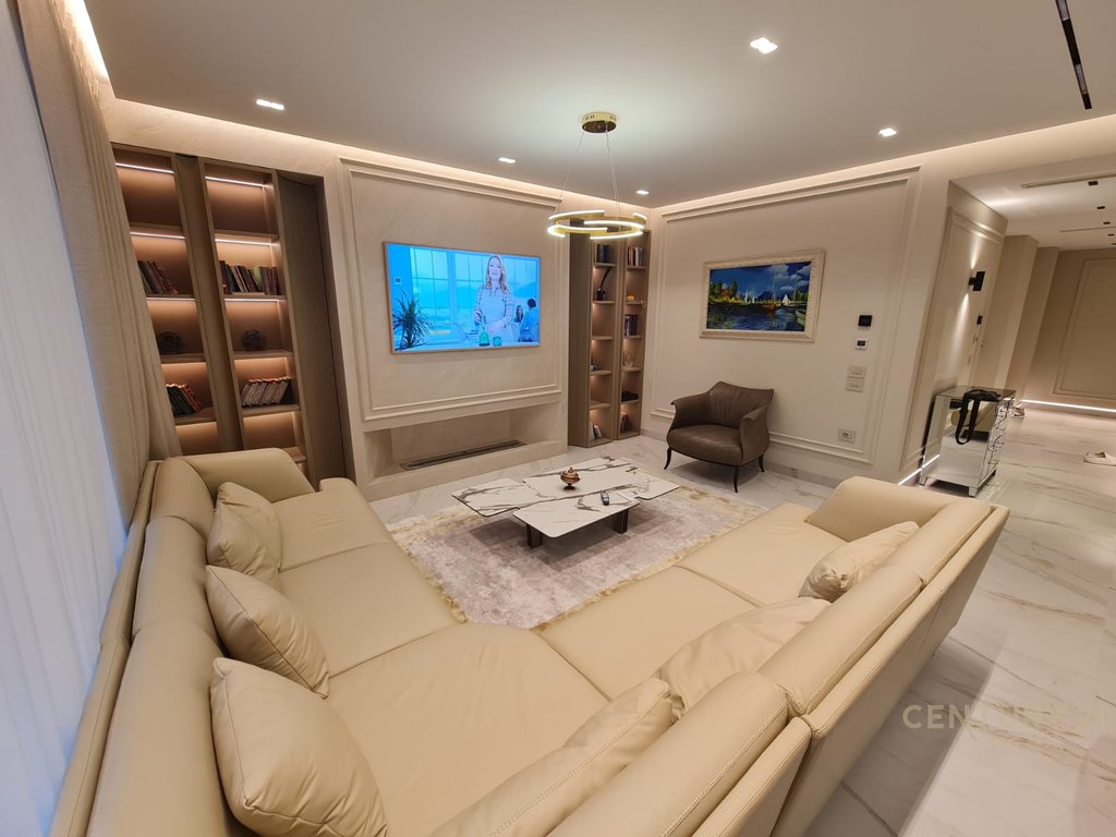 Shitet apartament modern 4+1+3 Premium ne nje nga zonat e preferuara te Tiranes, ne Komuna Parisit. - Ndodhet ne katin e 5-te te nje pallati te ri, shume cilesor, i sapoperfunduar. - Orientimi Jug-Lindje-Perëndim, i cili favorizon ndriçimin natyral gjatë gjithë ditës. -Ka siperfaqe totale 241.8m2 dhe siperfaqe te brendshme 214m2. Organizohet nga 1 korridor shperndares, nje sallon i madh, ambjent kuzhine dhe ngrenie, 4 dhoma gjumi, 3 tualete, 2 garderoba, 1 depo dhe 3 ballkone. E projektuar nga një arredues, apartamenti është investuar në detaje ku përzgjidhen materialet më të mira, përdorimi i teknologjive të reja në ndërtim është risia e këtij apartamenti. Ka te instaluar sistem kondicionimi Daikin VRF, sistem ngrohje ne dysheme, sistem elektrik smart, izolim akustik dhe termoizolues, i mobiluar ne stil modern. Pajisje elektrike hidrosanitare dhe shtëpiake, markat më të njohura Hitachi, Elektrolux, Aeg, Smeg etj Grila elektrike, sistem ndriçimi led, shina magnetike. Sistem sigurie me kamera. Pallati ku ndodhet ky Apartament Premium konsiderohet si një nga zonat rezidenciale më të preferuara të Tiranës, e cila ka një qasje të fortë ndaj jetesës komunitare. Përtej të dukshmes, komoditeti është ndjesia që do t'ju japë çdo element dhe detaj i ndërtesës dhe këtij apartamenti. Apartamenti eshte i disponueshem per nje vit nga momenti i shitjes.