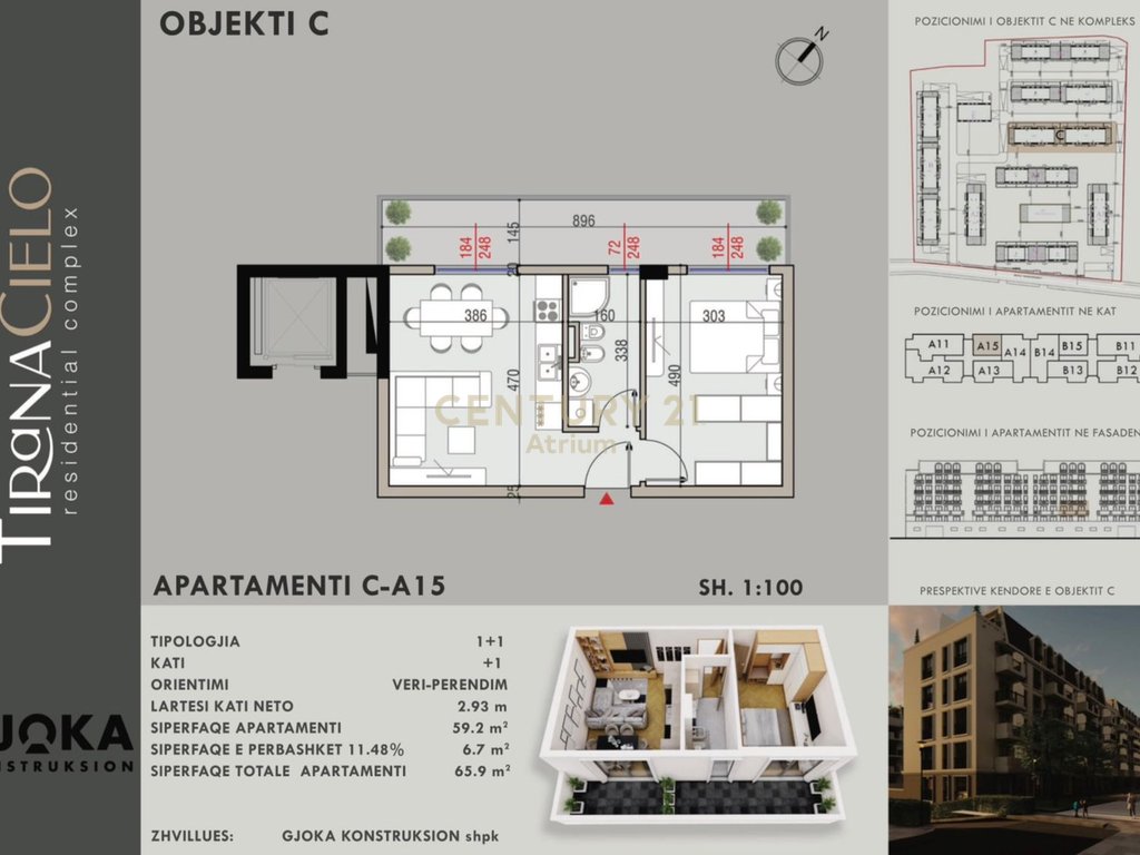 Apartamenti ka një sipërfaqe totale 65.9 m² (59.2 m² neto + 6.7 m² pjesë e përbashkët), me organizim shumë funksional: