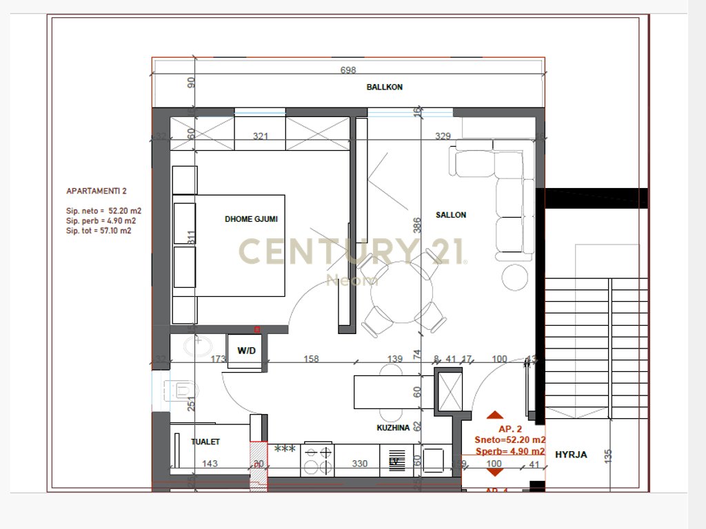 Me një sipërfaqe totale prej 57 m² (52 m² sipërfaqe e brendshme), prona ofron organizim funksional dhe shpërndarje efikase të hapësirave: