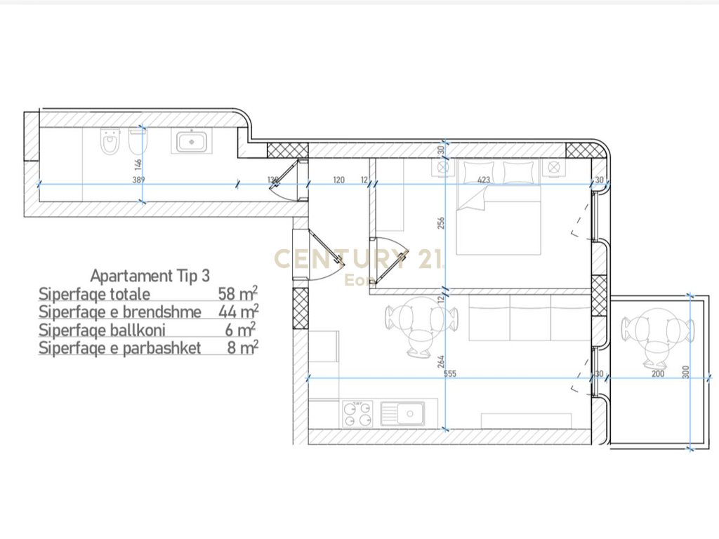 • Sipërfaqe bruto: 58 m²