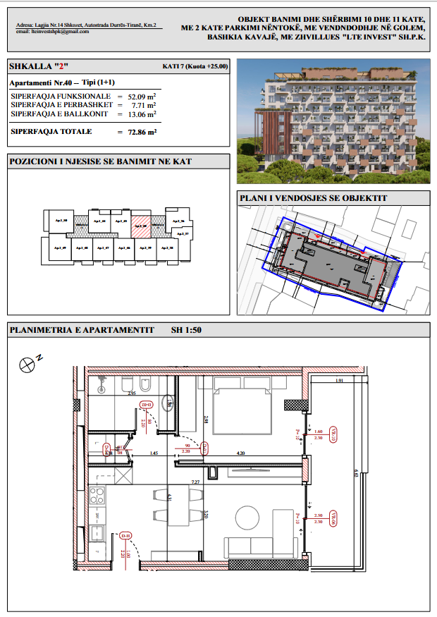 Apartamenti ka një sipërfaqe funksionale prej 52.09m², sipërfaqe të përbashkët 7.71m² dhe ballkon 13.06 m², me një sipërfaqe totale prej 72.86 m². Organizimi i brendshëm është mjaft praktik dhe përfshin një sallon të bollshëm së bashku me kuzhinën, një dhomë gjumi komode, një tualet dhe një ballkon të vogël për ajrosje dhe ndriçim natyral.